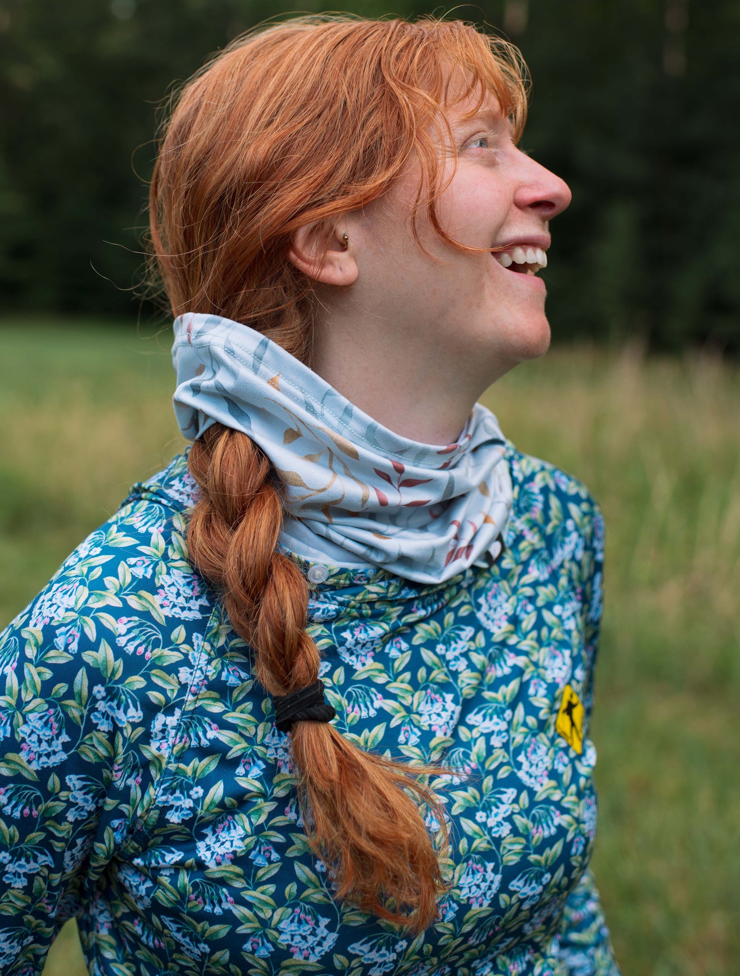 This is a neck gaiter for sun and wind protection in both warm and cool weather activities, designed with 3 unique 'pigtail ports' - the Rapunzel gaiter is specifically designed to be compatible with long hair for active pursuits. The gaiter works in three specific ways, designed to keep you warm and your skin covered: a single side braid or ponytail, pigtails (or double pony tails, and a back braid (or pony tail).