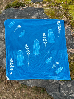Cyanotype prints are archival and meant to last for many years. However, they can be susceptible to yellowing or fading if exposed to phosphates or alkaline environments (like washing with detergents or rubbing your hands with natural oil). Minimize washing. If you need to, hand wash in cold water only and hang to dry. If using a detergent, be sure to minimally use a non-phosphate detergent to avoid any fading.